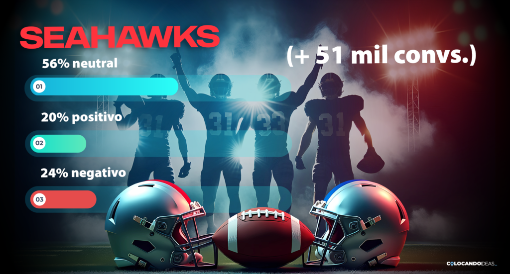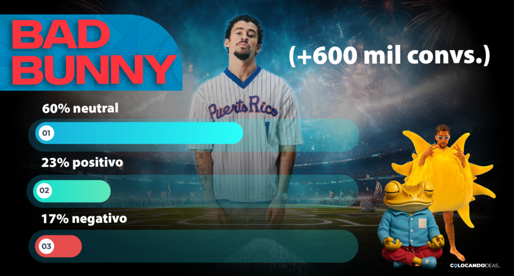 Respecto al sentimiento de la conversación, las menciones negativas se concentraron principalmente en el desempeño de los Patriotas de Nueva Inglaterra, así como en comentarios de corte ideológico relacionados con la decisión de algunos usuarios afines a Donald Trump de no seguir el evento por la participación de Bad Bunny en el medio tiempo, además del descontento previo por su elección como artista. En contraste, las menciones positivas se vincularon mayoritariamente al halftime show de Bad Bunny por el mensaje que transmitió y al festejo del campeonato de los Seahawks.